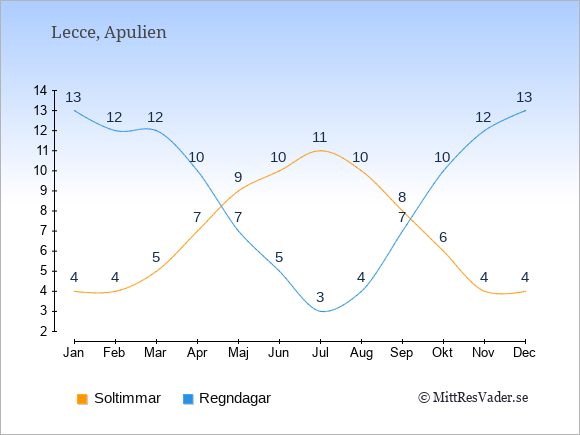 Grafen visar det genomsnittliga antalet soltimmar i Lecce under en viss månad (soltimmar är det antalet timmar per dag där solen skinnar), och antalet regndagar (dvs. det genomsnittliga antalet dagar