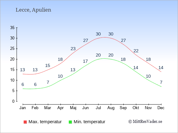 Grafen visar de genomsnittligt högsta temperaturerna i Lecce (vanligtvis det värde som uppmätts mitt på dagen) och de genomsnittligt lägsta temperaturer (vanligtvis tidpunkten just innan soluppgång).