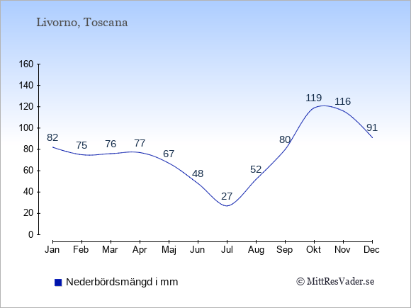 För att se hur vädret i Livorno skiljer sig från vädret hemma, kan du också jämföra siffrorna måned för måned med motsvarande siffror för Sverige under samma period här: Livornos klimat.