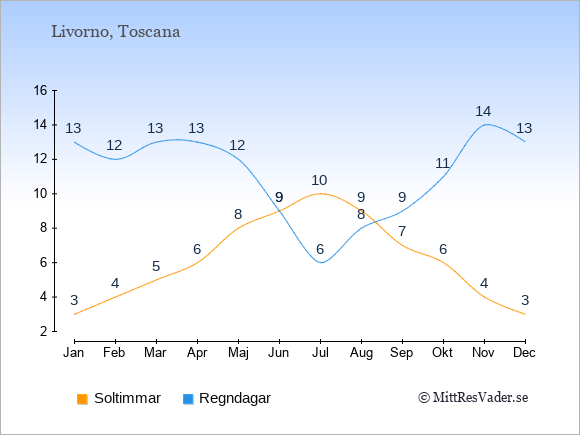 Grafen visar det genomsnittliga antalet soltimmar i Livorno under en viss månad (soltimmar är det antalet timmar per dag där solen skinnar), och antalet regndagar (dvs. det genomsnittliga antalet dagar