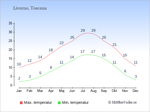 Grafen visar de genomsnittligt högsta temperaturerna i Livorno (vanligtvis det värde som uppmätts mitt på dagen) och de genomsnittligt lägsta temperaturer (vanligtvis tidpunkten just innan soluppgång).