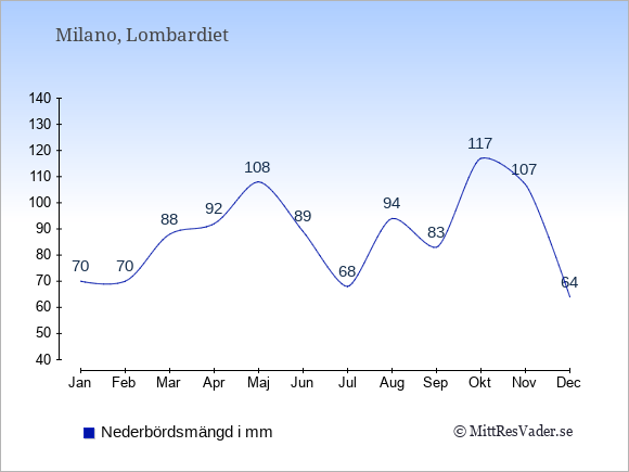 För att se hur vädret i Milano skiljer sig från vädret hemma, kan du också jämföra siffrorna måned för måned med motsvarande siffror för Sverige under samma period här: Milanos klimat.