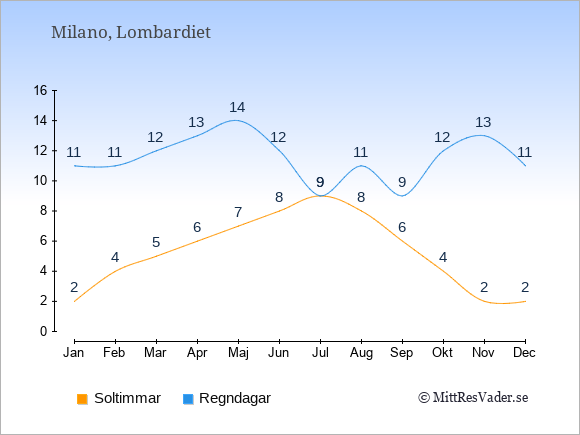 Grafen visar det genomsnittliga antalet soltimmar i Milano under en viss månad (soltimmar är det antalet timmar per dag där solen skinnar), och antalet regndagar (dvs. det genomsnittliga antalet dagar