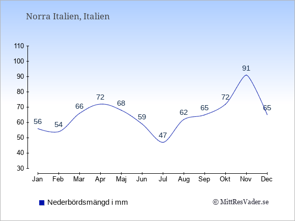 För att se hur vädret i Norra Italien skiljer sig från vädret hemma, kan du också jämföra siffrorna måned för måned med motsvarande siffror för Sverige under samma period här: Norra Italiens klimat.