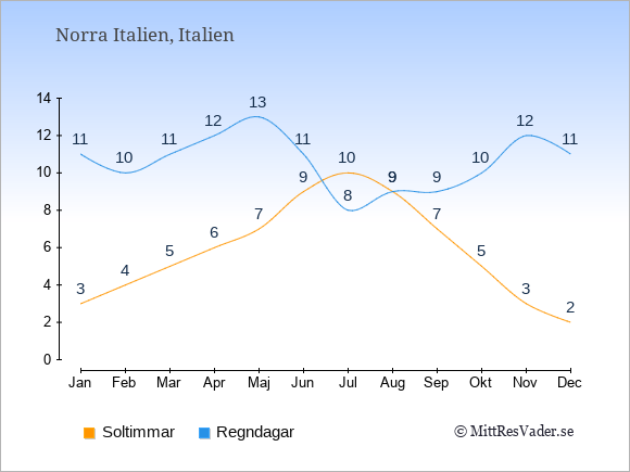 Grafen visar det genomsnittliga antalet soltimmar i Norra Italien under en viss månad (soltimmar är det antalet timmar per dag där solen skinnar), och antalet regndagar (dvs. det genomsnittliga antalet dagar