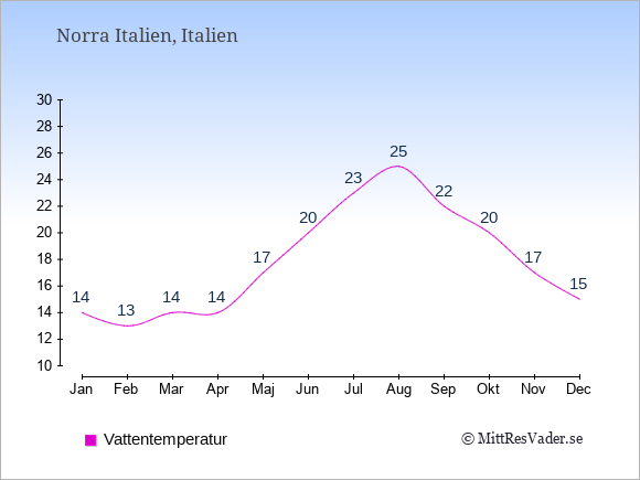 Få en överblick över vädret i Norra Italien månad för månad med temperaturer, vattentemperatur, soltimmar och nederbörd.
