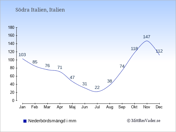 För att se hur vädret i Södra Italien skiljer sig från vädret hemma, kan du också jämföra siffrorna måned för måned med motsvarande siffror för Sverige under samma period här: Södra Italiens klimat.