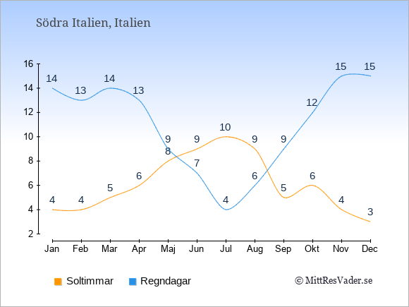 Grafen visar det genomsnittliga antalet soltimmar i Södra Italien under en viss månad (soltimmar är det antalet timmar per dag där solen skinnar), och antalet regndagar (dvs. det genomsnittliga antalet dagar