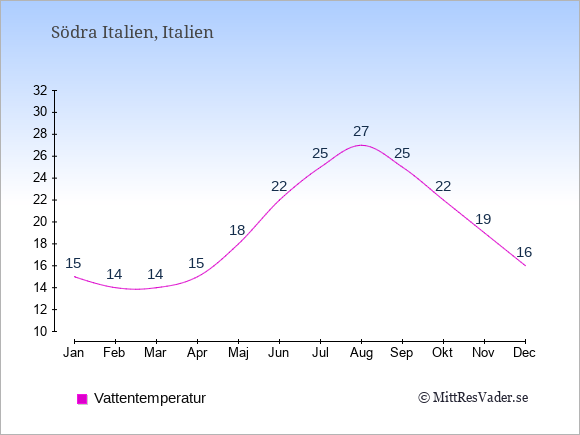 Få en överblick över vädret i Södra Italien månad för månad med temperaturer, vattentemperatur, soltimmar och nederbörd.