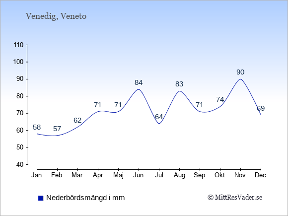 För att se hur vädret i Venedig skiljer sig från vädret hemma, kan du också jämföra siffrorna måned för måned med motsvarande siffror för Sverige under samma period här: Venedigs klimat.