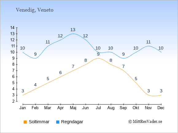 Grafen visar det genomsnittliga antalet soltimmar i Venedig under en viss månad (soltimmar är det antalet timmar per dag där solen skinnar), och antalet regndagar (dvs. det genomsnittliga antalet dagar