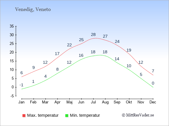 Grafen visar de genomsnittligt högsta temperaturerna i Venedig (vanligtvis det värde som uppmätts mitt på dagen) och de genomsnittligt lägsta temperaturer (vanligtvis tidpunkten just innan soluppgång).