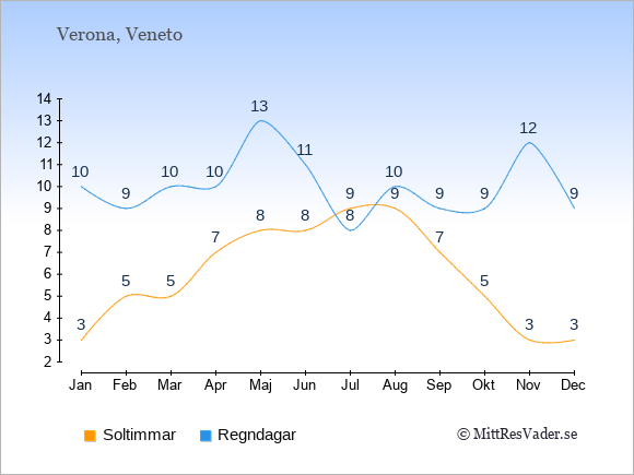 Grafen visar det genomsnittliga antalet soltimmar i Verona under en viss månad (soltimmar är det antalet timmar per dag där solen skinnar), och antalet regndagar (dvs. det genomsnittliga antalet dagar