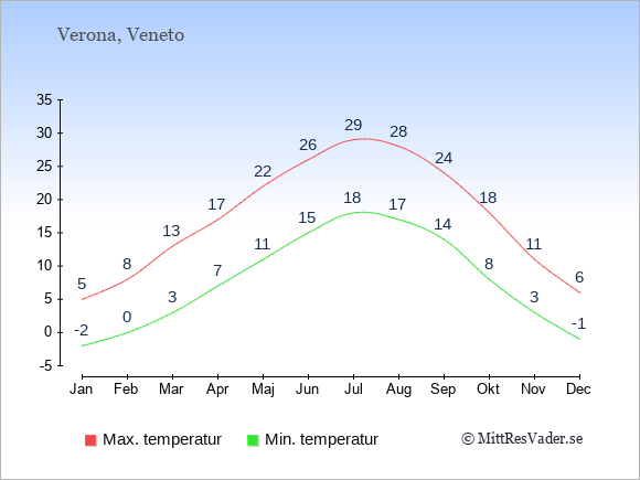 För att se hur vädret i Verona skiljer sig från vädret hemma, kan du också jämföra siffrorna måned för måned med motsvarande siffror för Sverige under samma period här: Veronas klimat.