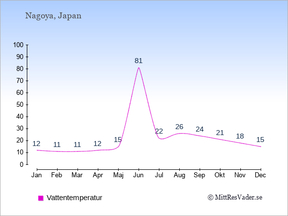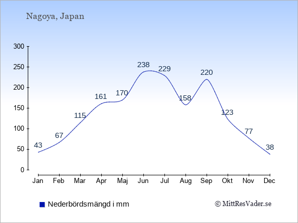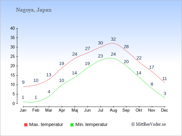 För att se hur vädret i Nagoya skiljer sig från vädret hemma, kan du också jämföra siffrorna måned för måned med motsvarande siffror för Sverige under samma period här: Nagoyas klimat.