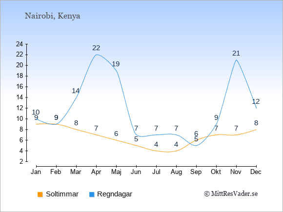 På denna sida kan du få en överblick över de statistiska klimatuppgifterna för Nairobi månad för månad jämfört med klimatet i Stockholm. Information om det historiska klimatet kan du använda för att planera din semester och hitta den bästa tiden att resa till Nairobi på.