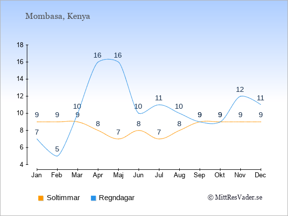 Grafen visar det genomsnittliga antalet soltimmar i Mombasa under en viss månad (soltimmar är det antalet timmar per dag där solen skinnar), och antalet regndagar (dvs. det genomsnittliga antalet dagar