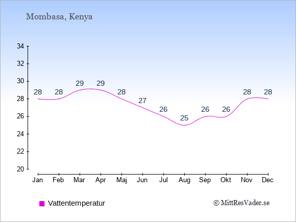 Grafen visar de genomsnittligt högsta temperaturerna i Mombasa (vanligtvis det värde som uppmätts mitt på dagen) och de genomsnittligt lägsta temperaturer (vanligtvis tidpunkten just innan soluppgång).