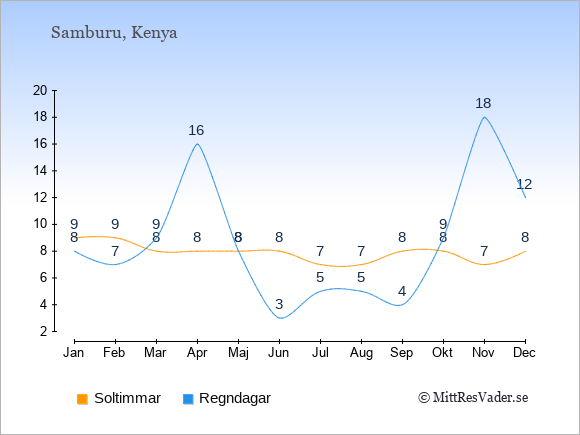 Grafen visar det genomsnittliga antalet soltimmar i Samburu under en viss månad (soltimmar är det antalet timmar per dag där solen skinnar), och antalet regndagar (dvs. det genomsnittliga antalet dagar