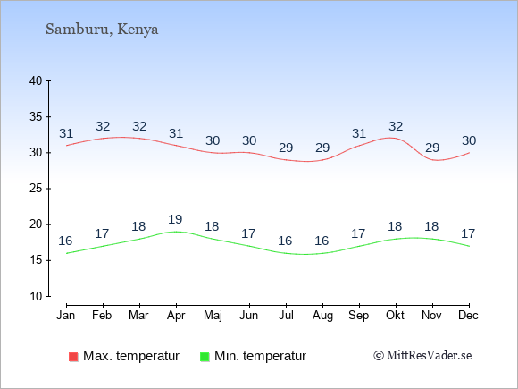 Grafen visar de genomsnittligt högsta temperaturerna i Samburu (vanligtvis det värde som uppmätts mitt på dagen) och de genomsnittligt lägsta temperaturer (vanligtvis tidpunkten just innan soluppgång).