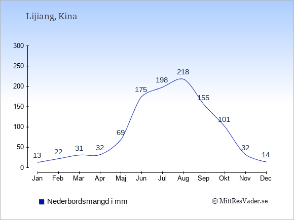 För att se hur vädret i Lijiang skiljer sig från vädret hemma, kan du också jämföra siffrorna måned för måned med motsvarande siffror för Sverige under samma period här: Lijiangs klimat.