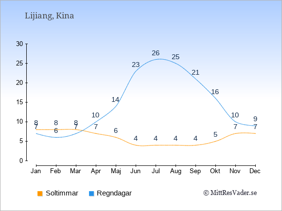 Grafen visar det genomsnittliga antalet soltimmar i Lijiang under en viss månad (soltimmar är det antalet timmar per dag där solen skinnar), och antalet regndagar (dvs. det genomsnittliga antalet dagar