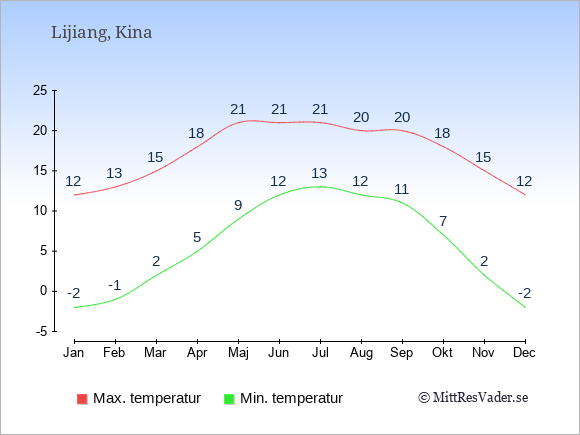 Grafen visar de genomsnittligt högsta temperaturerna i Lijiang (vanligtvis det värde som uppmätts mitt på dagen) och de genomsnittligt lägsta temperaturer (vanligtvis tidpunkten just innan soluppgång).