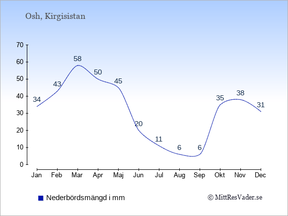 För att se hur vädret i Osh skiljer sig från vädret hemma, kan du också jämföra siffrorna måned för måned med motsvarande siffror för Sverige under samma period här: Oshs klimat.