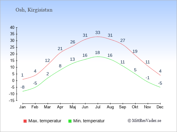 Grafen visar de genomsnittligt högsta temperaturerna i Osh (vanligtvis det värde som uppmätts mitt på dagen) och de genomsnittligt lägsta temperaturer (vanligtvis tidpunkten just innan soluppgång).