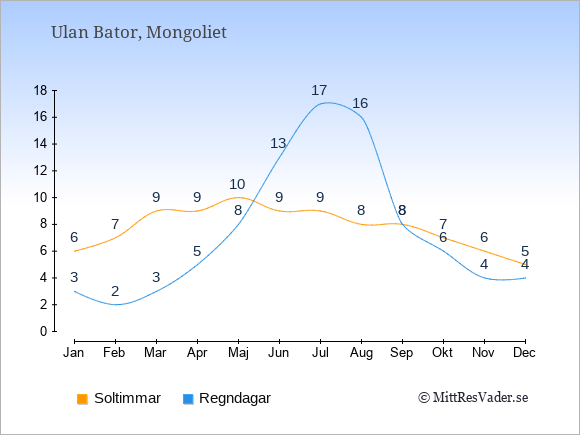 Graferna visar det genomsnittliga antalet soltimmar i Ulan Bator per dag