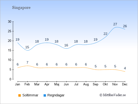 Graferna visar det genomsnittliga antalet soltimmar i Singapore per dag