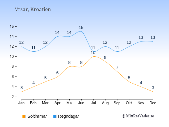 På denna sida kan du få en överblick över de statistiska klimatuppgifterna för Vrsar månad för månad jämfört med klimatet i Stockholm. Information om det historiska klimatet kan du använda för att planera din semester och hitta den bästa tiden att resa till Vrsar på.