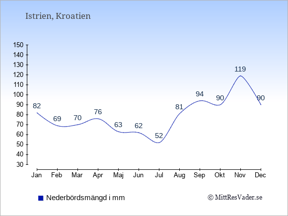 Vädret i Istrien är oftast bäst i de månader där det finns många soltimmar och få dagars nederbörd.