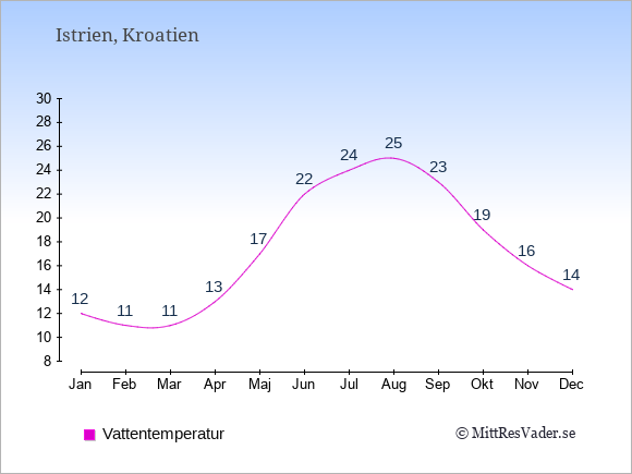 Grafen visar de genomsnittligt högsta temperaturerna i Istrien (vanligtvis det värde som uppmätts mitt på dagen) och de genomsnittligt lägsta temperaturer (vanligtvis tidpunkten just innan soluppgång).