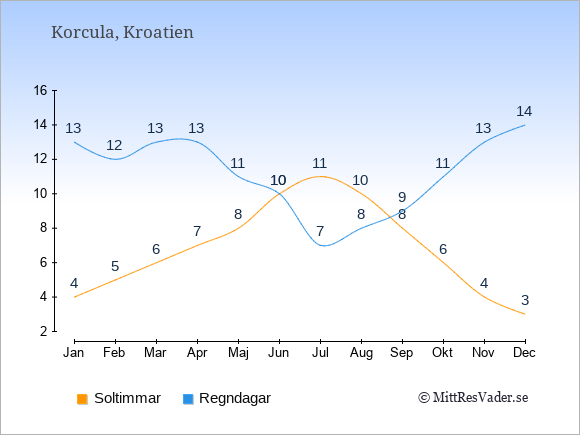Grafen visar det genomsnittliga antalet soltimmar på Korcula under en viss månad (soltimmar är det antalet timmar per dag där solen skinnar), och antalet regndagar (dvs. det genomsnittliga antalet dagar