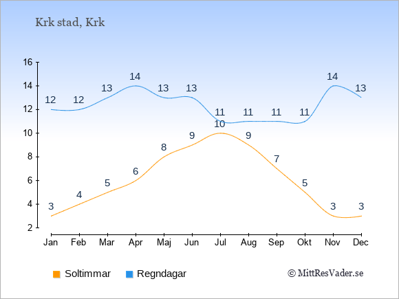 Grafen visar det genomsnittliga antalet soltimmar i Krk stad under en viss månad (soltimmar är det antalet timmar per dag där solen skinnar), och antalet regndagar (dvs. det genomsnittliga antalet dagar