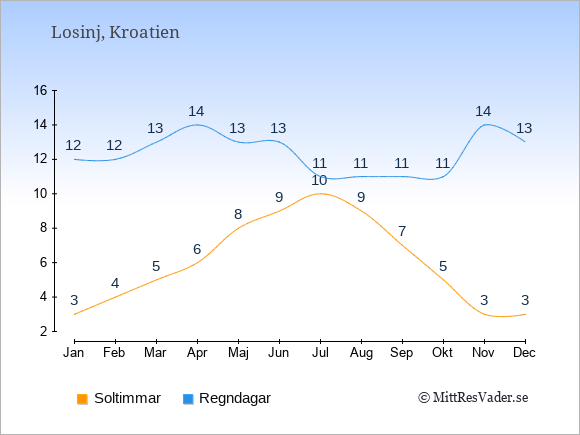 Grafen visar det genomsnittliga antalet soltimmar på Losinj under en viss månad (soltimmar är det antalet timmar per dag där solen skinnar), och antalet regndagar (dvs. det genomsnittliga antalet dagar