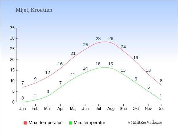 Grafen visar de genomsnittligt högsta temperaturerna på Mljet (vanligtvis det värde som uppmätts mitt på dagen) och de genomsnittligt lägsta temperaturer (vanligtvis tidpunkten just innan soluppgång).