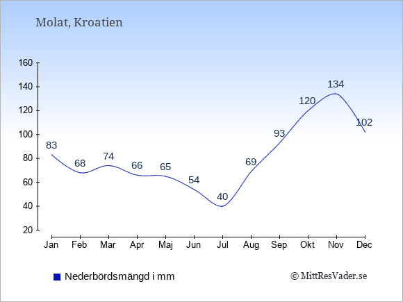 För att se hur vädret på Molat skiljer sig från vädret hemma, kan du också jämföra siffrorna måned för måned med motsvarande siffror för Sverige under samma period här: Molats klimat.