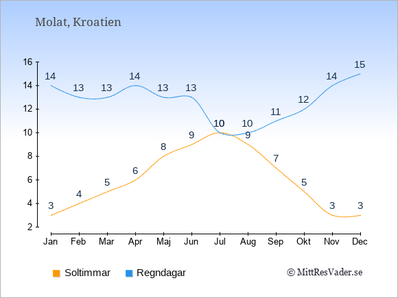 Grafen visar det genomsnittliga antalet soltimmar på Molat under en viss månad (soltimmar är det antalet timmar per dag där solen skinnar), och antalet regndagar (dvs. det genomsnittliga antalet dagar