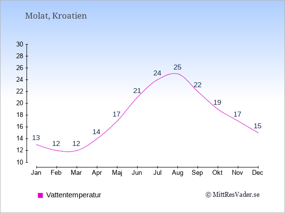Grafen visar de genomsnittligt högsta temperaturerna på Molat (vanligtvis det värde som uppmätts mitt på dagen) och de genomsnittligt lägsta temperaturer (vanligtvis tidpunkten just innan soluppgång).