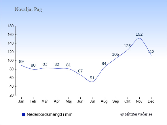 För att se hur vädret i Novalja skiljer sig från vädret hemma, kan du också jämföra siffrorna måned för måned med motsvarande siffror för Sverige under samma period här: Novaljas klimat.