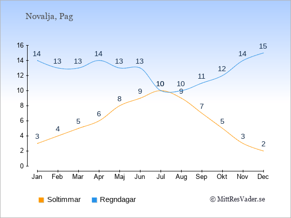 Grafen visar det genomsnittliga antalet soltimmar i Novalja under en viss månad (soltimmar är det antalet timmar per dag där solen skinnar), och antalet regndagar (dvs. det genomsnittliga antalet dagar