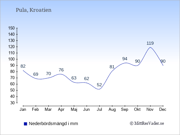 För att se hur vädret i Pula skiljer sig från vädret hemma, kan du också jämföra siffrorna måned för måned med motsvarande siffror för Sverige under samma period här: Pulas klimat.