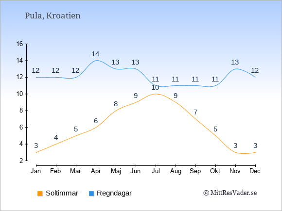 Grafen visar det genomsnittliga antalet soltimmar i Pula under en viss månad (soltimmar är det antalet timmar per dag där solen skinnar), och antalet regndagar (dvs. det genomsnittliga antalet dagar