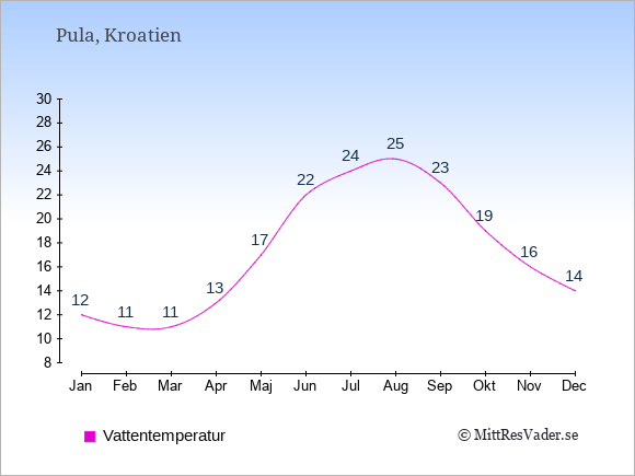 Grafen visar de genomsnittligt högsta temperaturerna i Pula (vanligtvis det värde som uppmätts mitt på dagen) och de genomsnittligt lägsta temperaturer (vanligtvis tidpunkten just innan soluppgång).