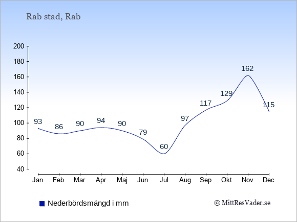 För att se hur vädret i Rab stad skiljer sig från vädret hemma, kan du också jämföra siffrorna måned för måned med motsvarande siffror för Sverige under samma period här: Rab stads klimat.
