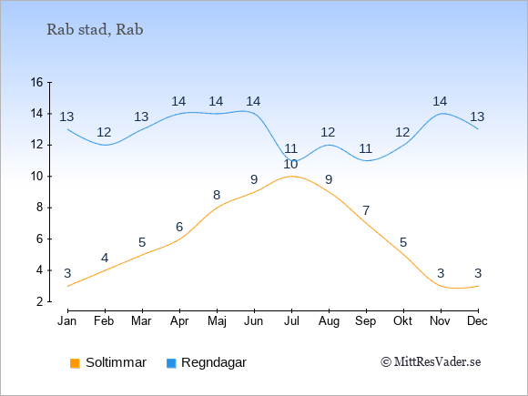 Grafen visar det genomsnittliga antalet soltimmar i Rab stad under en viss månad (soltimmar är det antalet timmar per dag där solen skinnar), och antalet regndagar (dvs. det genomsnittliga antalet dagar
