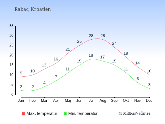 Grafen visar de genomsnittligt högsta temperaturerna i Rabac (vanligtvis det värde som uppmätts mitt på dagen) och de genomsnittligt lägsta temperaturer (vanligtvis tidpunkten just innan soluppgång).