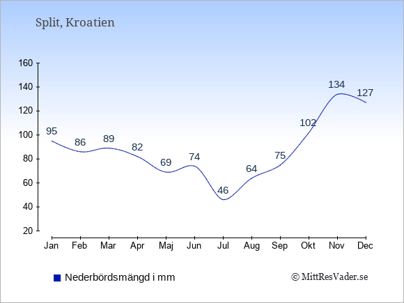 Vädret i Split är oftast bäst i de månader där det finns många soltimmar och få dagars nederbörd.